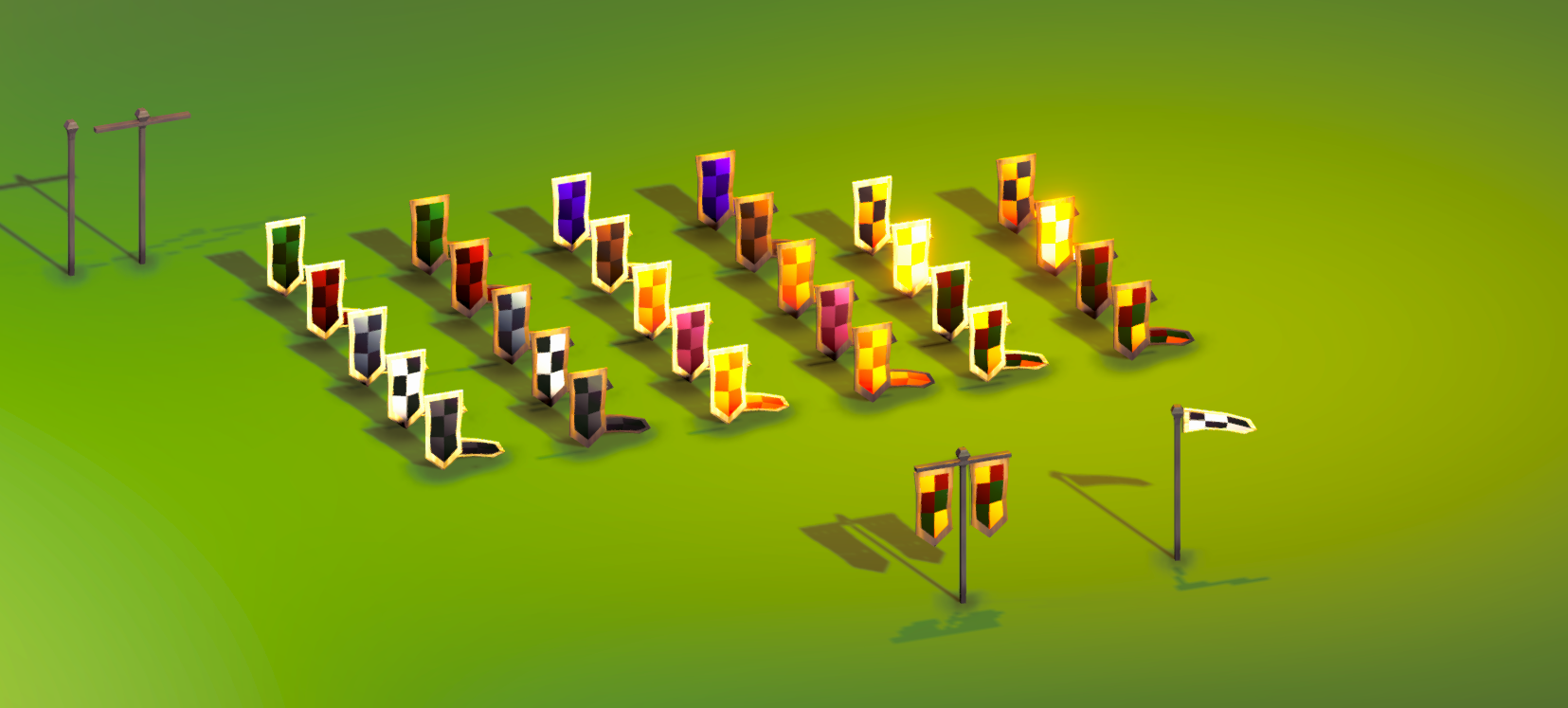 - Includes decorative banners in 14 color variations, each with 2 back options: a traditional long banner and a thinner triangular banner. Two pole variations are included for battle-standard style. Vertex counts range from 44–84.