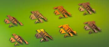 - Contains 4 modular roof sets: a basic low-poly, planked, lapped, and shingle variant. Vertex counts range from 10–20 in lighter sets (basic and planked) to 150–1000 in the more detailed lapped and shingle versions.